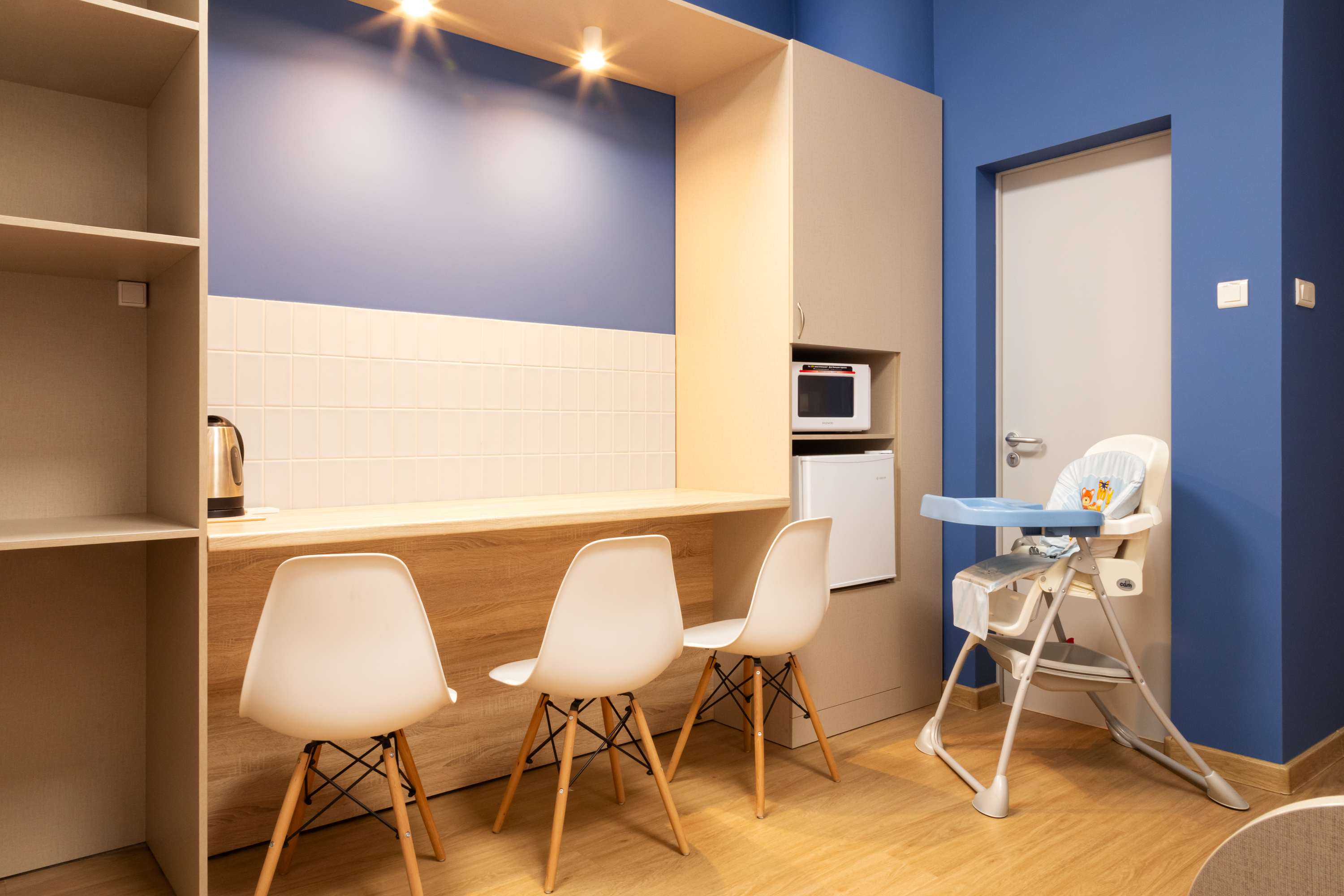 место для приёма пищи, с микроволновой печью и детской мебелью для удобства кормления самых маленьких пассажиров;